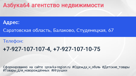Азбука64, агентство недвижимости по адресу Саратовская область, Балаково, Студенецкая, 67 в дальнейшем Организация, размещена в следующих категориях: