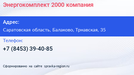 Энергокомплект 2000, компания по адресу Саратовская область, Балаково, Трнавская, 35 в дальнейшем Организация, размещена в следующих категориях: