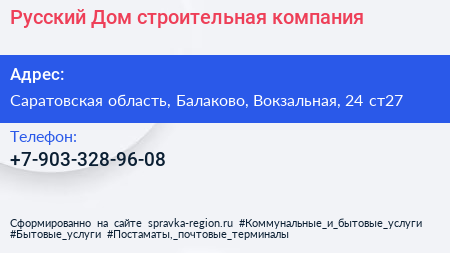 Русский Дом, строительная компания по адресу Саратовская область, Балаково, Вокзальная, 24 ст27 в дальнейшем Организация, размещена в следующих категориях:
