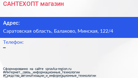САНТЕХОПТ, магазин по адресу Саратовская область, Балаково, Минская, 122/4 в дальнейшем Организация, размещена в следующих категориях: