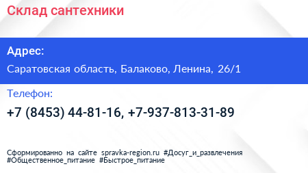 Склад сантехники по адресу Саратовская область, Балаково, Ленина, 26/1 в дальнейшем Организация, размещена в следующих категориях: