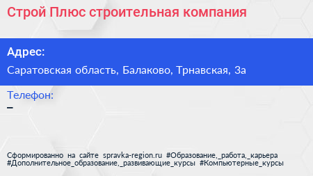 Строй-Плюс, строительная компания по адресу Саратовская область, Балаково, Трнавская, 3а в дальнейшем Организация, размещена в следующих категориях: