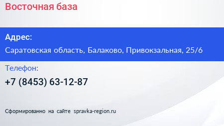 Восточная база по адресу Саратовская область, Балаково, Привокзальная, 25/6 в дальнейшем Организация, размещена в следующих категориях: