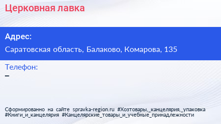 Церковная лавка по адресу Саратовская область, Балаково, Комарова, 135 в дальнейшем Организация, размещена в следующих категориях: