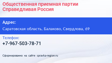 Общественная приемная партии Справедливая Россия по адресу Саратовская область, Балаково, Свердлова, 69 в дальнейшем Организация, размещена в следующих категориях: