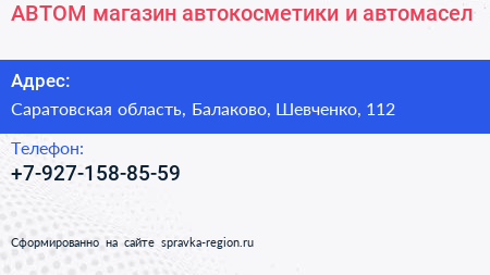 АВТОМ, магазин автокосметики и автомасел по адресу Саратовская область, Балаково, Шевченко, 112 в дальнейшем Организация, размещена в следующих категориях: