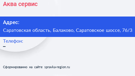 Аква сервис по адресу Саратовская область, Балаково, Саратовское шоссе, 76/3 в дальнейшем Организация, размещена в следующих категориях: