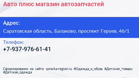 Авто плюс, магазин автозапчастей по адресу Саратовская область, Балаково, проспект Героев, 46/1 в дальнейшем Организация, размещена в следующих категориях:
