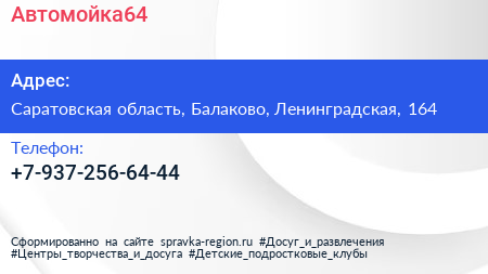 Автомойка64 по адресу Саратовская область, Балаково, Ленинградская, 164 в дальнейшем Организация, размещена в следующих категориях: