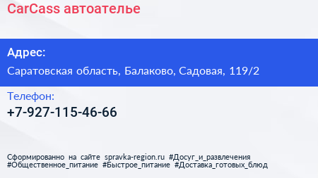 CarCass, автоателье по адресу Саратовская область, Балаково, Садовая, 119/2 в дальнейшем Организация, размещена в следующих категориях: