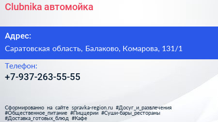 Clubnika, автомойка по адресу Саратовская область, Балаково, Комарова, 131/1 в дальнейшем Организация, размещена в следующих категориях: