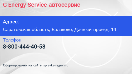 G-Energy Service, автосервис по адресу Саратовская область, Балаково, Дачный проезд, 14 в дальнейшем Организация, размещена в следующих категориях: