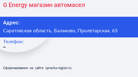 G Energy, магазин автомасел по адресу Саратовская область, Балаково, Пролетарская, 63 в дальнейшем Организация, размещена в следующих категориях: