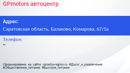 GPmotors, автоцентр по адресу Саратовская область, Балаково, Комарова, 67/5а в дальнейшем Организация, размещена в следующих категориях: