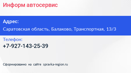 Информ, автосервис по адресу Саратовская область, Балаково, Транспортная, 13/3 в дальнейшем Организация, размещена в следующих категориях: