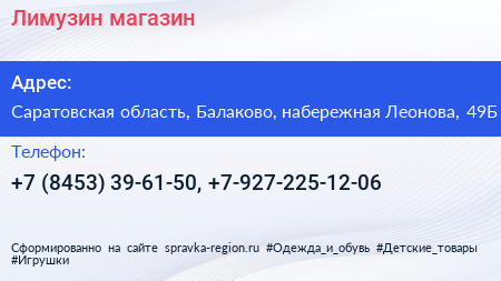 Лимузин, магазин по адресу Саратовская область, Балаково, набережная Леонова, 49Б в дальнейшем Организация, размещена в следующих категориях: