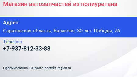 Магазин автозапчастей из полиуретана по адресу Саратовская область, Балаково, 30 лет Победы, 76 в дальнейшем Организация, размещена в следующих категориях: