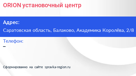 ORION, установочный центр по адресу Саратовская область, Балаково, Академика Королёва, 2/8 в дальнейшем Организация, размещена в следующих категориях: