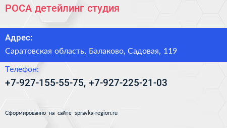 РОСА, детейлинг-студия по адресу Саратовская область, Балаково, Садовая, 119 в дальнейшем Организация, размещена в следующих категориях: