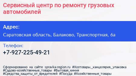 Сервисный центр по ремонту грузовых автомобилей по адресу Саратовская область, Балаково, Транспортная, 6а в дальнейшем Организация, размещена в следующих категориях: