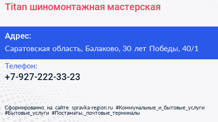 Titan, шиномонтажная мастерская по адресу Саратовская область, Балаково, 30 лет Победы, 40/1 в дальнейшем Организация, размещена в следующих категориях: