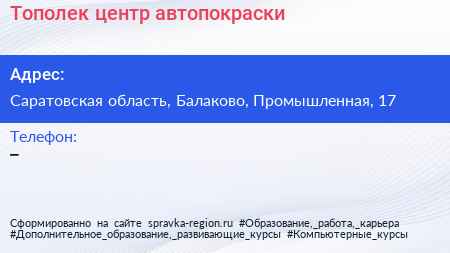 Тополек, центр автопокраски по адресу Саратовская область, Балаково, Промышленная, 17 в дальнейшем Организация, размещена в следующих категориях: