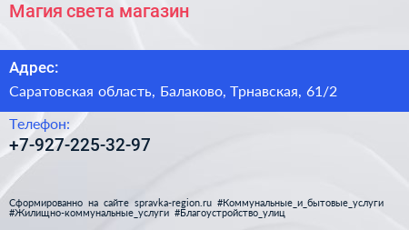 Магия света, магазин по адресу Саратовская область, Балаково, Трнавская, 61/2 в дальнейшем Организация, размещена в следующих категориях: