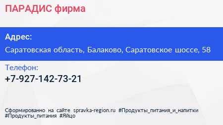 ПАРАДИС, фирма по адресу Саратовская область, Балаково, Саратовское шоссе, 58 в дальнейшем Организация, размещена в следующих категориях: