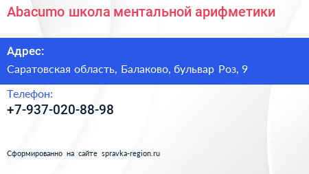 Abacumo, школа ментальной арифметики по адресу Саратовская область, Балаково, бульвар Роз, 9 в дальнейшем Организация, размещена в следующих категориях: