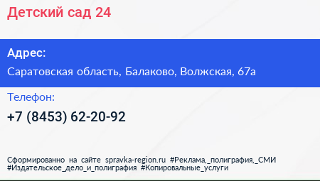 Детский сад №24 по адресу Саратовская область, Балаково, Волжская, 67а в дальнейшем Организация, размещена в следующих категориях: