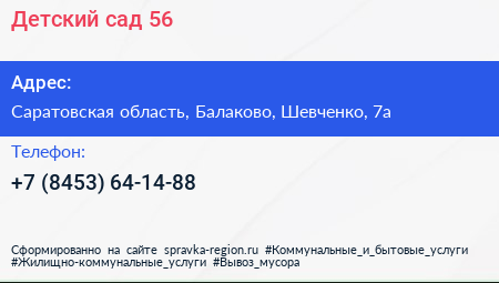 Детский сад №56 по адресу Саратовская область, Балаково, Шевченко, 7а в дальнейшем Организация, размещена в следующих категориях: