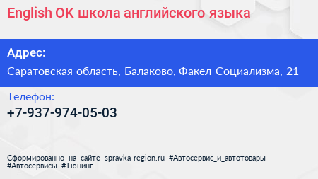 English OK, школа английского языка по адресу Саратовская область, Балаково, Факел Социализма, 21 в дальнейшем Организация, размещена в следующих категориях: