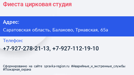 Фиеста, цирковая студия по адресу Саратовская область, Балаково, Трнавская, 65а в дальнейшем Организация, размещена в следующих категориях: