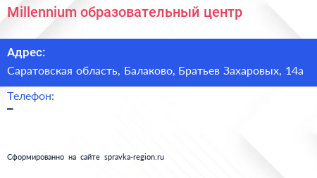 Millennium, образовательный центр по адресу Саратовская область, Балаково, Братьев Захаровых, 14а в дальнейшем Организация, размещена в следующих категориях: