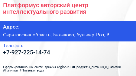 Платформус, авторский центр интеллектуального развития по адресу Саратовская область, Балаково, бульвар Роз, 9 в дальнейшем Организация, размещена в следующих категориях: