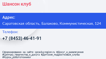 Шансон, клуб по адресу Саратовская область, Балаково, Коммунистическая, 124 в дальнейшем Организация, размещена в следующих категориях: