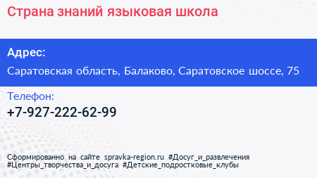Страна знаний, языковая школа по адресу Саратовская область, Балаково, Саратовское шоссе, 75 в дальнейшем Организация, размещена в следующих категориях: