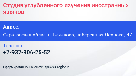 Студия углубленного изучения иностранных языков по адресу Саратовская область, Балаково, набережная Леонова, 47 в дальнейшем Организация, размещена в следующих категориях: