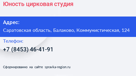 Юность, цирковая студия по адресу Саратовская область, Балаково, Коммунистическая, 124 в дальнейшем Организация, размещена в следующих категориях: