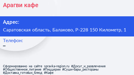 Арагви, кафе по адресу Саратовская область, Балаково, Р-228 150 Километр, 1 в дальнейшем Организация, размещена в следующих категориях: