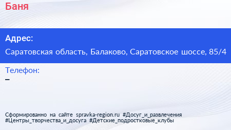 Баня по адресу Саратовская область, Балаково, Саратовское шоссе, 85/4 в дальнейшем Организация, размещена в следующих категориях: