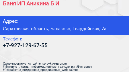 Баня, ИП Аникина Б.И. по адресу Саратовская область, Балаково, Гвардейская, 7а в дальнейшем Организация, размещена в следующих категориях: