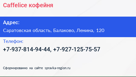 Caffelice, кофейня по адресу Саратовская область, Балаково, Ленина, 120 в дальнейшем Организация, размещена в следующих категориях: