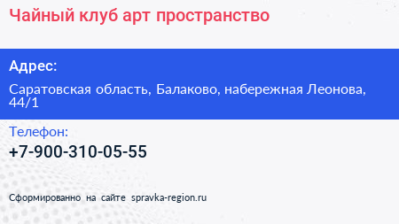 Чайный клуб, арт-пространство по адресу Саратовская область, Балаково, набережная Леонова, 44/1 в дальнейшем Организация, размещена в следующих категориях: