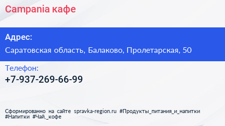 Campania, кафе по адресу Саратовская область, Балаково, Пролетарская, 50 в дальнейшем Организация, размещена в следующих категориях: