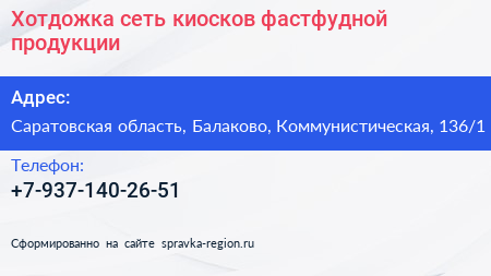 Хотдожка, сеть киосков фастфудной продукции по адресу Саратовская область, Балаково, Коммунистическая, 136/1 в дальнейшем Организация, размещена в следующих категориях: