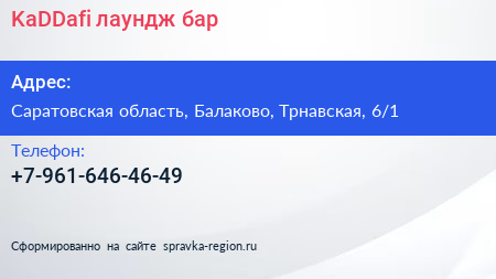 KaDDafi, лаундж-бар по адресу Саратовская область, Балаково, Трнавская, 6/1 в дальнейшем Организация, размещена в следующих категориях: