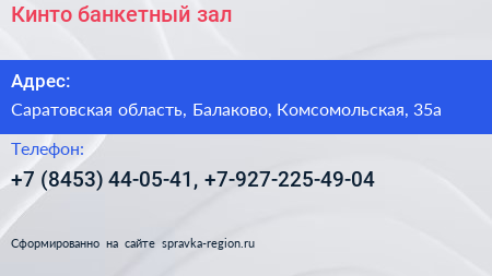 Кинто, банкетный зал по адресу Саратовская область, Балаково, Комсомольская, 35а в дальнейшем Организация, размещена в следующих категориях: