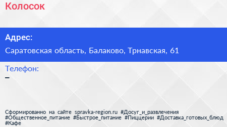 Колосок по адресу Саратовская область, Балаково, Трнавская, 61 в дальнейшем Организация, размещена в следующих категориях:
