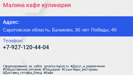 Малина, кафе-кулинария по адресу Саратовская область, Балаково, 30 лет Победы, 40 в дальнейшем Организация, размещена в следующих категориях: